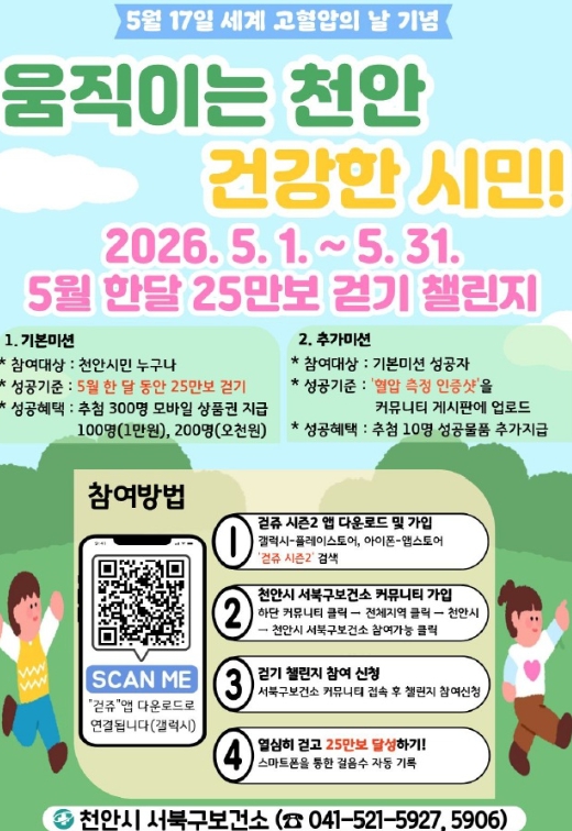챌린지는 천안시민 누구나 참여할 수 있으며, ‘걷쥬 시즌2’ 앱을 통해 신청하면 된다. 이와 함께 5월 17일 세계 고혈압의 날을 기념해 ‘혈압수치 알기 캠페인’도 운영한다.